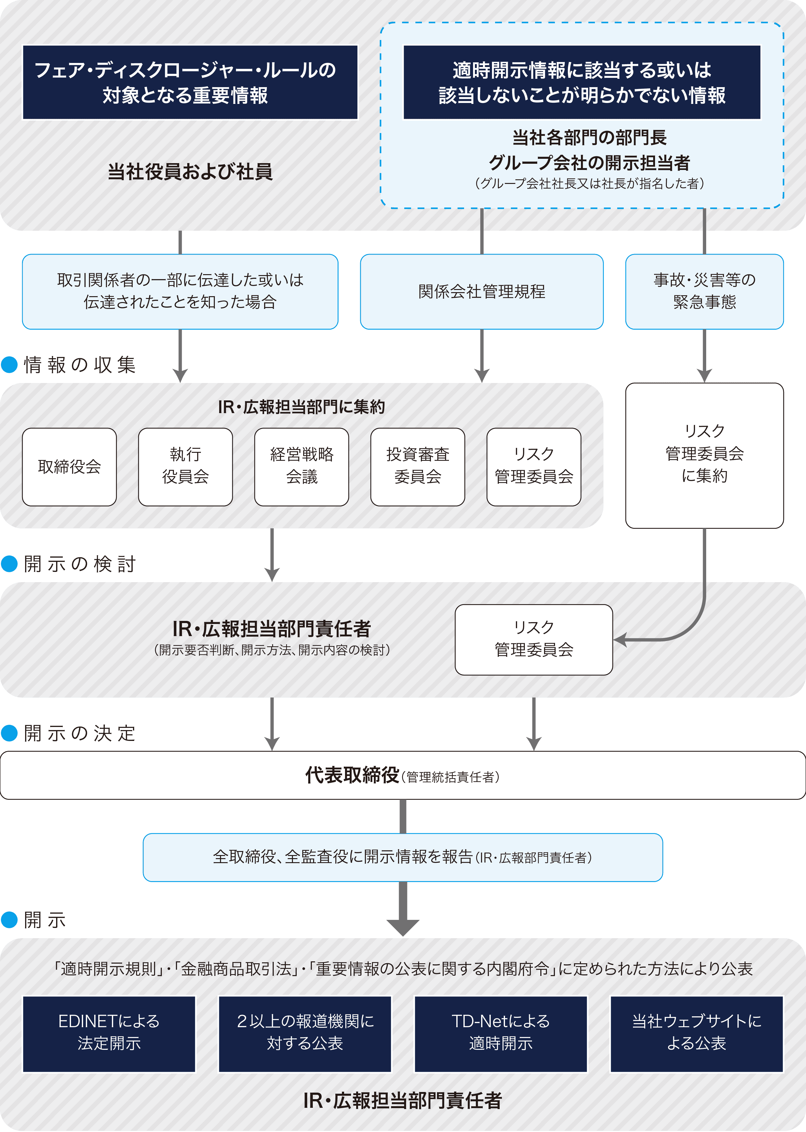 当社は、「金融商品取引法第27条の36の規定」に関する留意事項(フェア・ディスクロージャー・ルールガイドラン) に基づき、株主・投資家の皆さまに適時・的確かつ公平な情報を提供するため、東京証券取引所スタンダード市場の定める適時開示に関する規則に準拠した情報、その他の重要な情報を迅速に公開するほか、当社を理解していただくために有効な情報についても、積極的に開示していきます。
